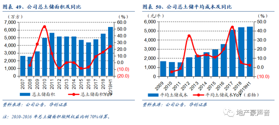 截至2019H1末,公司总土储面积6,407万方,对货值1.14万亿,覆盖2019年销售额4.4倍。如将19H1末预收款529亿元按照70%的权益比例还原,则可售货值在1.06万亿,覆盖2019年销售额4.1倍。截至2019H1末公司平均土储成本5,446元/平,2017年至今平均土储成本占比当期销售均价稳定在31%左右。考虑到公司2019H2拿地更为积极,预计公司至2019年末土储进一步提升。