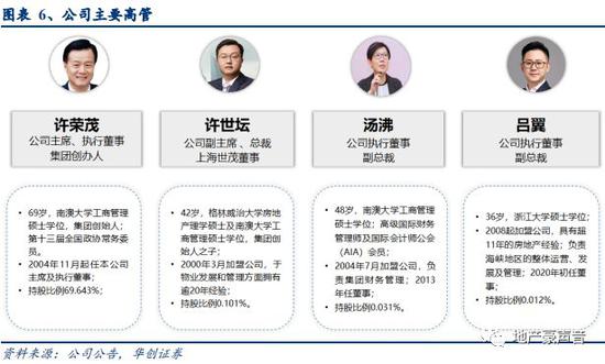 公司目前主要高管为四位,其中包括创始人许荣茂、总裁许世坛、副总裁汤沸(2004年加入公司,2013年起任董事,分管财务),以及2020年初新提拔的吕翼(2008年加入公司,世茂海峡公司总监)。