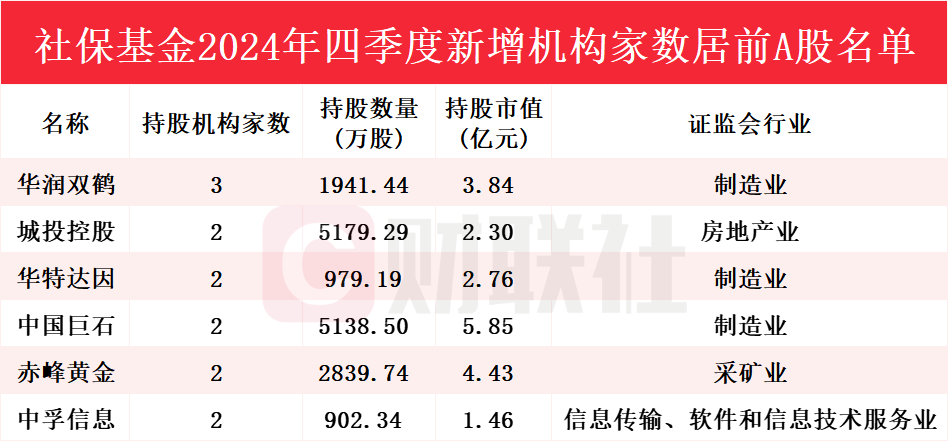 从最新持仓动向来看,choice数据显示,社保基金2024年四季度新进入52家个股的前十大流通股东名单。其中,华润双鹤新增社保基金持股家数最多,达到三家。此外,城投控股、华特达因、中国巨石、赤峰黄金和中孚信息新增社保基金持股家数均达到2家。具体情况如下图: