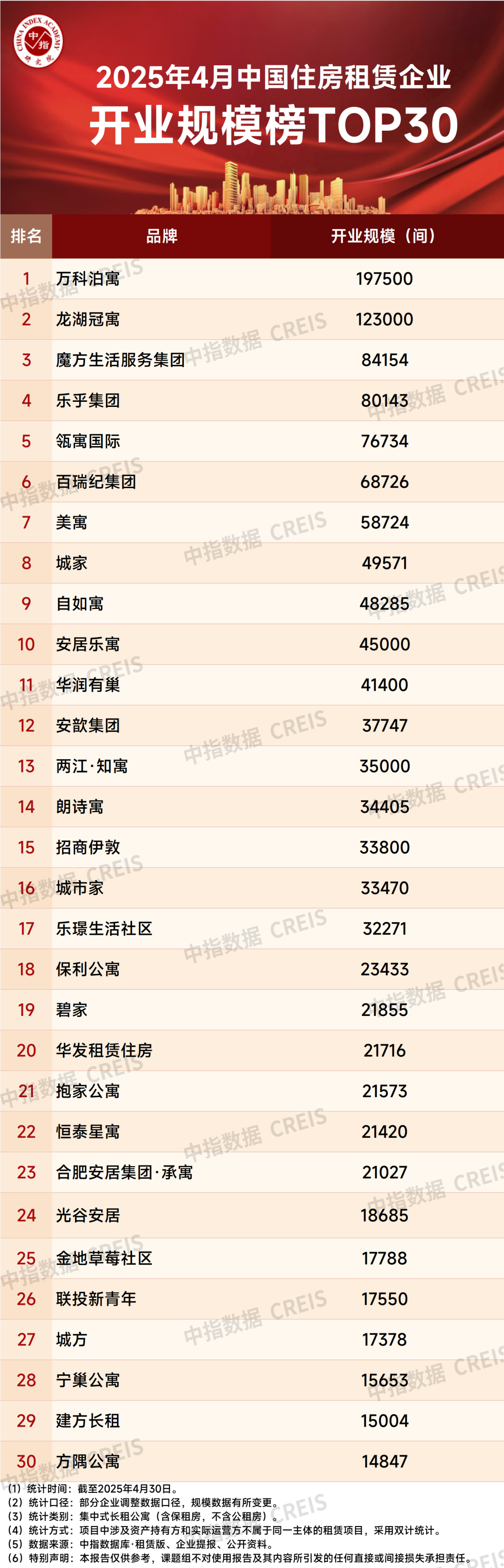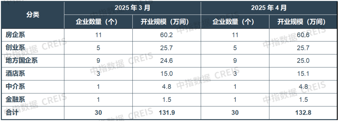 据中指研究院统计,2025年4月,TOP30集中式长租公寓企业累计开业房源量达132.8万间,较3月增加约0.9万间。