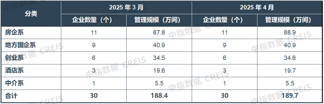 据中指研究院统计,2025年4月,TOP30集中式长租公寓企业累计管理房源量达189.7万间,较3月增加约1.3万间。