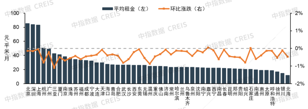 2.重点城市租金:50城中仅2个城市住宅平均租金环比有所上涨,数量明显减少