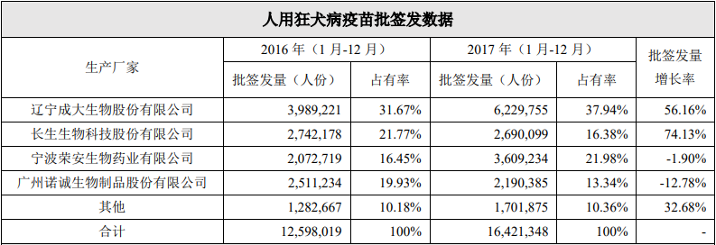 在2018年“疫苗事件”前,长春长生的狂犬疫苗曾占据一定市场空间。历史财务数据显示,2016年与2017年,成大生物狂犬疫苗批签发数量为398.92万人份与622.98万人份,市场占有率为31.67%与37.94%,同期长生生物批签发数量为274.22万人份与269.01万人份,市占率为21.77%与16.38%。