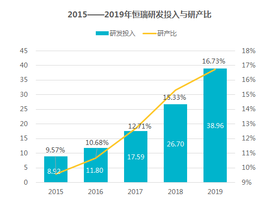 其实看一看研发支出就很明白了,恒瑞医药5 年累计研发投入高达103.97亿,且比重每年在不断升高,2019年已经达到38.96亿元,研发比达到16.73%,位列A股药企第一位。事实上,目前致力于新药研发已经成为全球顶级生物制药企业的产业导向,随着新药研发成本的不断攀升,全球医药研发投入预计在2021年将高达1600亿美元。