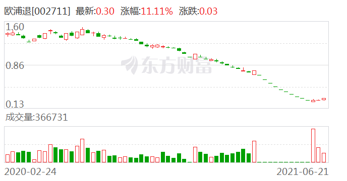 沪深交易所2021年06月21日公布的交易公开信息显示,欧浦退因成为退市整理的证券上榜。欧浦退当日收报0.30元,涨跌幅11.11%,换手率3.49%,成交额1025.01万元。