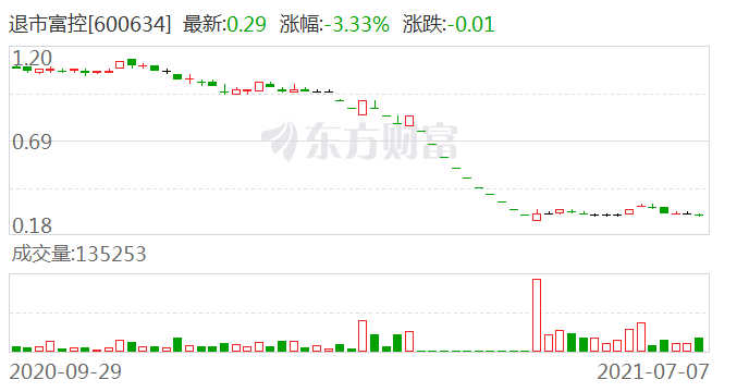 沪深交易所2021年07月07日公布的交易公开信息显示,退市富控因成为退市整理的证券上榜。退市富控当日收报0.29元,涨跌幅-3.33%,换手率2.35%,成交额395.64万元。