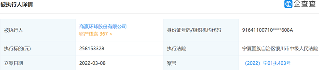 3月9日,商赢环球股份有限公司(以下简称“*ST环球(维权)”)被宁夏回族自治区银川市中级人民法院列为被执行人,该案案号为(2022)宁01执403号,执行标的为2.58亿元,立案日期为3月8日。