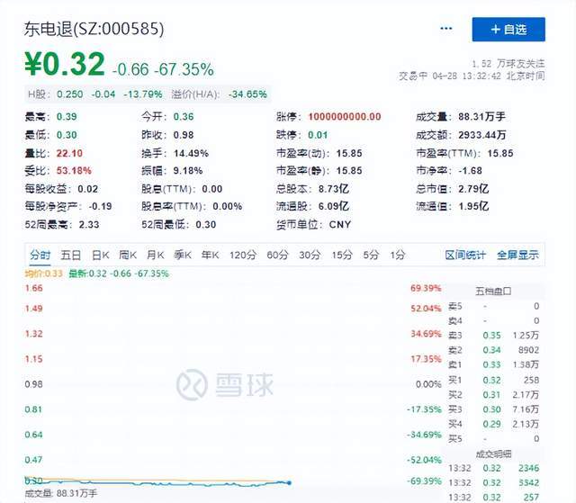 4月28日,东电退盘中一度跌近70%。截至发稿,该股报0.32元/股,跌67.35%,总市值2.79亿元。