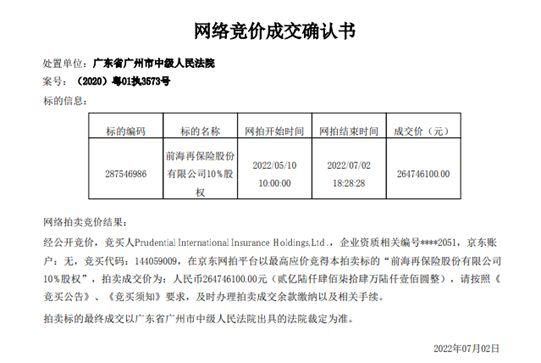 7月,前海再保险10%再次竞拍,经公开竞价,竞买人保德信国际(Prudential International Insurance Holdings,Ltd .)一次竞拍成功,拍卖标的最终成交以广东省广州市中级人民法院出具的法院裁定为准。