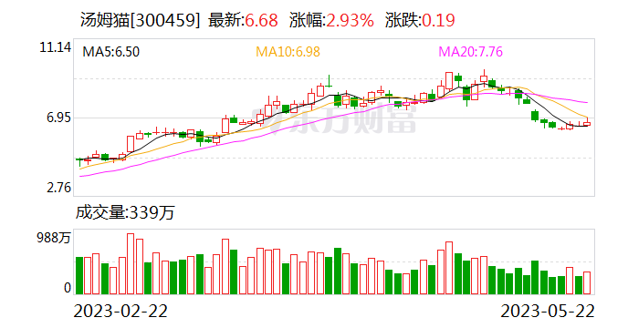 在二级市场上,汤姆猫是一只AI概念大牛股,2023年1月初至4月25日期间,该公司股价大涨近200%,市值从110亿元飙涨至328亿元。5月以来,公司股价从高位回落,至今回调了23%,最新市值为235亿元。