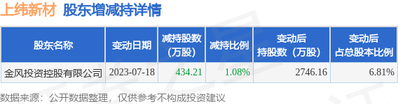 7月18日上纬新材发布公告《上纬新材:上纬新材关于持股5%以上股东减持达到1%的提示性公告》,其股东金风投资控股有限公司于2023年7月17日至2023年7月18日间合计减持434.21万股,占公司目前总股本的1.0769%,变动期间该股股价上涨4.92%,截止7月18日收盘报8.96元。