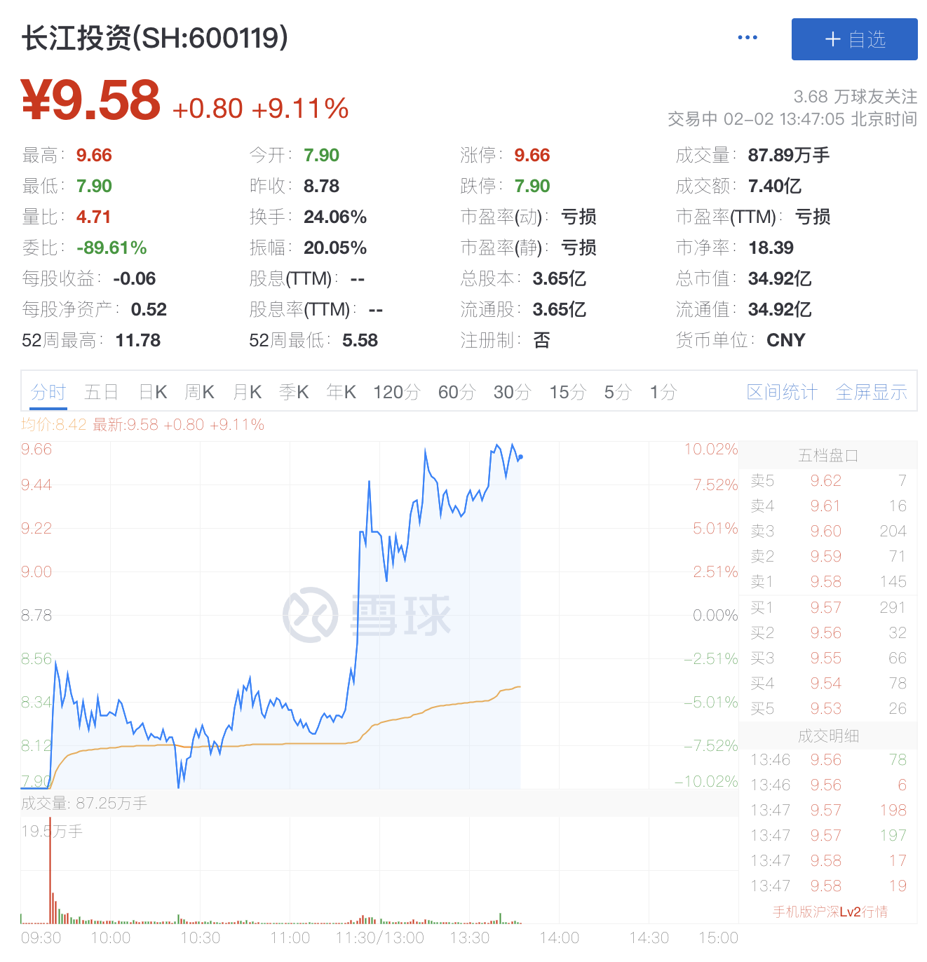 瑞财经 徐迪2月2日,长江投资(600119.SH)早间以跌停价开盘,午后直线拉升,一度触及涨停,上演“地天板”。截至发稿,该股报9.56元,涨幅9.11%,成交额7.4亿元。。