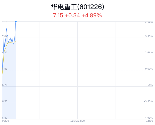 02月28日,华电重工(601226)股价大幅上涨,截至09点51分,华电重工上涨5.14%,报7.16元/股,创近1月新高,成交4919万元,换手率0.61%,振幅5.73%。