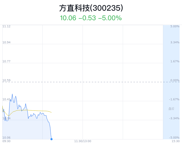 02月28日,方直科技(300235)股价大幅下跌,截至10点43分,方直科技下跌5.00%,报10.06元/股,成交1.25亿元,换手率5.98%,振幅4.06%。