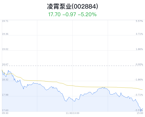 02月28日,凌霄泵业(002884)股价大幅下跌,截至14点55分,凌霄泵业下跌5.14%,报17.71元/股,成交4972万元,换手率1.00%,振幅4.66%。