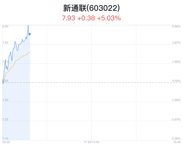 02月29日,新通联(维权)(603022)股价大幅上涨,截至10点03分,新通联上涨5.03%,报7.93元/股,成交1503万元,换手率0.97%,振幅5.70%。