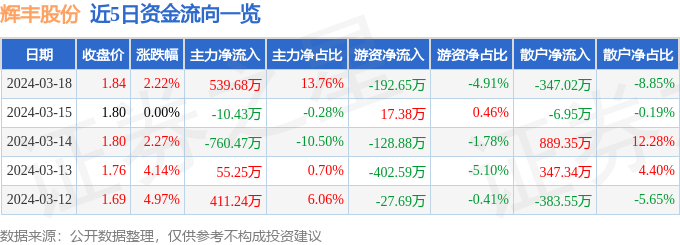 3月18日的资金流向数据方面,主力资金净流入539.68万元,占总成交额13.76%,游资资金净流出192.65万元,占总成交额4.91%,散户资金净流出347.02万元,占总成交额8.85%。