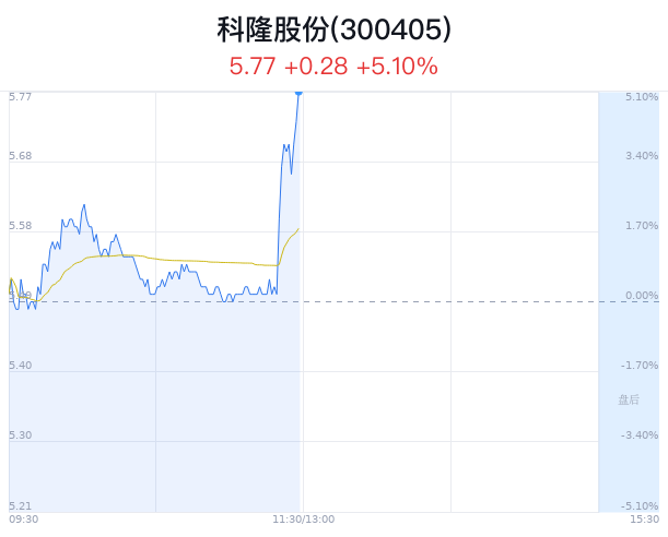 03月21日,科隆股份(300405)股价大幅上涨,截至11点28分,科隆股份上涨5.10%,报5.77元/股,成交1.08亿元,换手率8.82%,振幅5.65%。