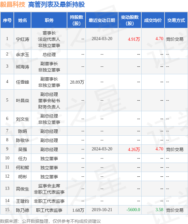 证券之星消息,根据3月22日市场公开信息、上市公司公告及交易所披露数据整理,毅昌科技(002420)最新董监高及相关人员股份变动情况:2024年3月21日公司董事宁红涛共增持公司股份6.0万股,占公司总股本为0.015%。变动期间公司股价上涨0.43%,3月21日当日收盘报4.72元。