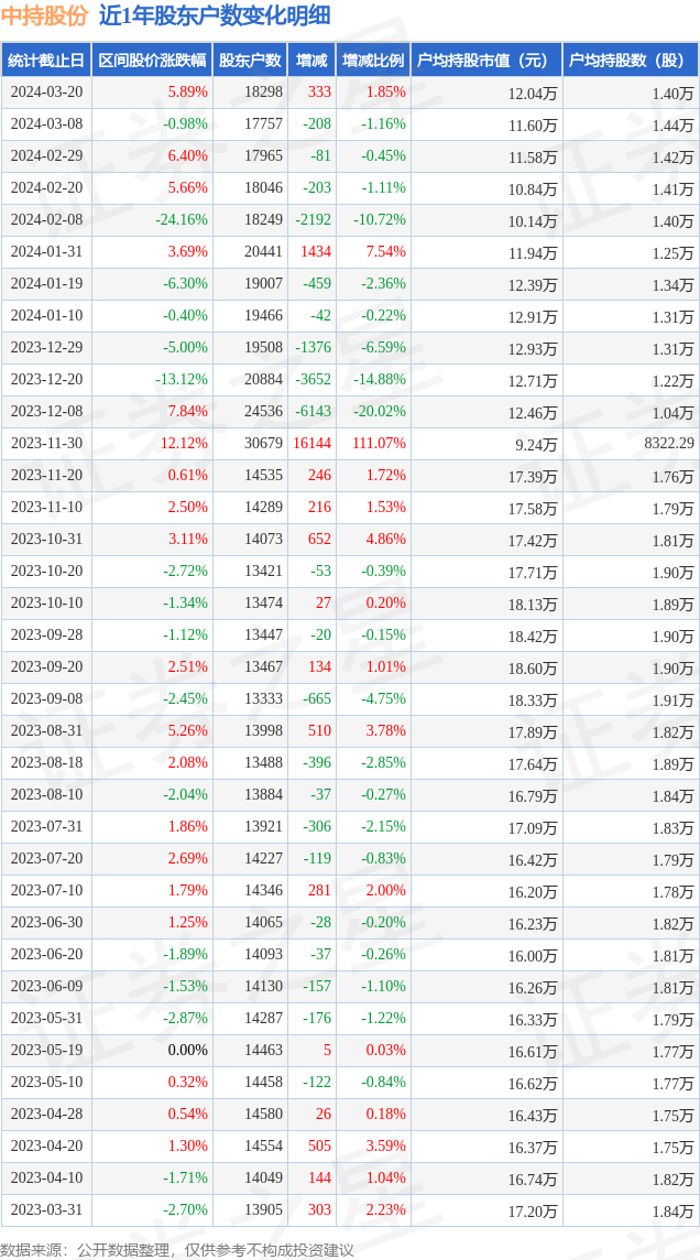 从股价来看,2024年2月29日至2024年3月20日,中持股份区间涨幅为5.89%,在此期间股东户数增加333.0户,增幅为1.85%。