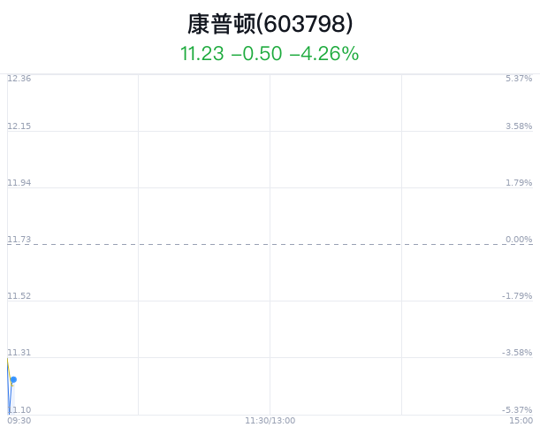 04月09日,康普顿(603798)股价大幅下跌,截至09点30分,康普顿下跌5.03%,报11.14元/股,成交1353万元,换手率0.47%,振幅2.05%。