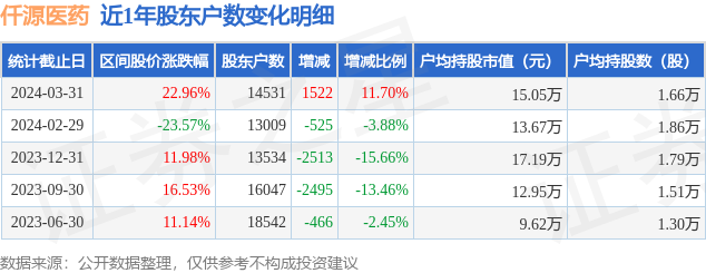 从股价来看,2024年2月29日至2024年3月31日,仟源医药区间涨幅为22.96%,在此期间股东户数增加1522.0户,增幅为11.7%。