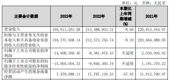 挖贝网4月20日,廊坊发展 近日发布2023年年度报告,报告期内公司实现营业收入195,011,261.28元,同比下滑8.66%;归属于上市公司股东的净利润-14,908,569.40元,较上年同期亏损增加。