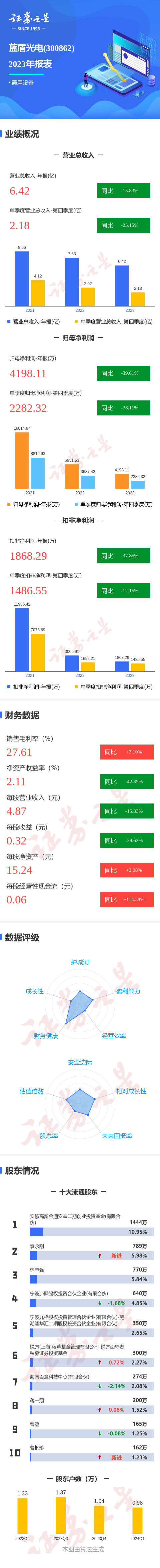 证券之星消息,蓝盾光电2023年年报显示,公司主营收入6.43亿元,同比下降15.83%;归母净利润4198.11万元,同比下降39.61%;扣非净利润1868.29万元,同比下降37.85%;其中2023年第四季度,公司单季度主营收入2.19亿元,同比下降25.15%;单季度归母净利润2282.33万元,同比下降38.11%;单季度扣非净利润1486.55万元,同比下降12.15%;负债率20.11%,投资收益1460.29万元,财务费用-1159.12万元,毛利率27.61%。