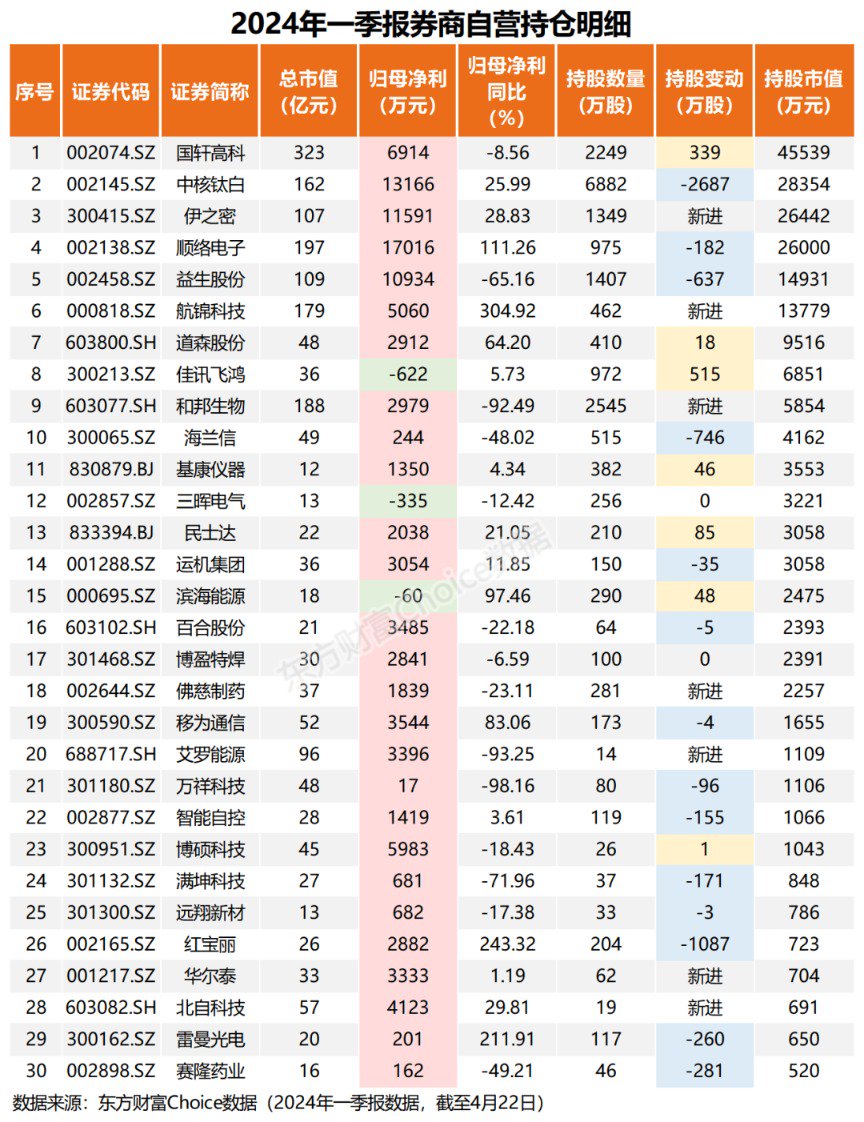 随着上市公司一季报的陆续披露,券商自营盘的最新持仓情况露出水面。截至4月22日,A股共计400家公司披露了2024年一季报,其中30家公司的前十大流通股东中出现了券商自营盘的身影。