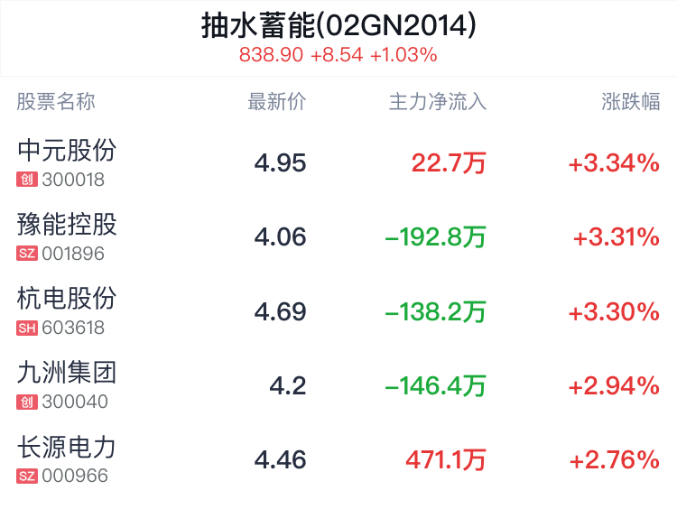 04月24日,抽水蓄能概念盘中拉升,截至10点42分,抽水蓄能概念整体指数上涨1.03%,报838.900点。