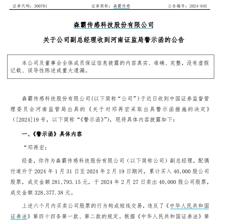【大河财立方消息】4月25日,森霸传感公告,公司副总经理邓再宏收到中国证券监督管理委员会河南监管局出具的警示函。