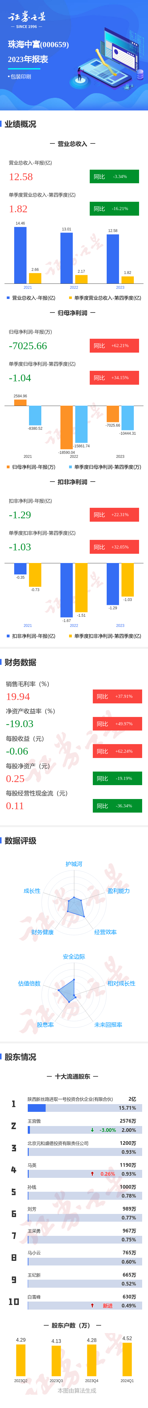证券之星消息,珠海中富2023年年报显示,公司主营收入12.58亿元,同比下降3.34%;归母净利润-7025.66万元,同比上升62.21%;扣非净利润-1.3亿元,同比上升22.31%;其中2023年第四季度,公司单季度主营收入1.83亿元,同比下降16.21%;单季度归母净利润-1.04亿元,同比上升34.15%;单季度扣非净利润-1.03亿元,同比上升32.05%;负债率86.72%,财务费用9083.54万元,毛利率19.94%。