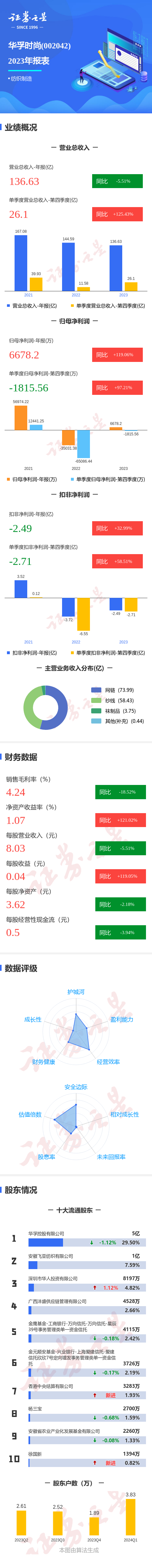 证券之星消息,华孚时尚2023年年报显示,公司主营收入136.63亿元,同比下降5.51%;归母净利润6678.21万元,同比上升119.06%;扣非净利润-2.5亿元,同比上升32.99%;其中2023年第四季度,公司单季度主营收入26.11亿元,同比上升125.43%;单季度归母净利润-1815.57万元,同比上升97.21%;单季度扣非净利润-2.72亿元,同比上升58.51%;负债率62.16%,投资收益4348.19万元,财务费用1.81亿元,毛利率4.24%。
