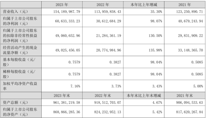 挖贝网4月27日,日月明 近日发布2023年年度报告,报告期内公司实现营业收入154,189,987.79元,同比增长35.30%;归属于上市公司股东的净利润60,633,333.23元,同比增长98.07%。