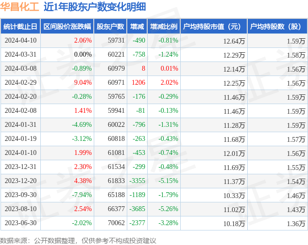 从股价来看,2024年3月31日至2024年4月10日,华昌化工区间涨幅为2.06%,在此期间股东户数减少490.0户,减幅为0.81%。