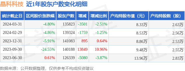 从股价来看,2024年2月29日至2024年3月31日,晶科科技区间跌幅为4.8%,在此期间股东户数减少3501.0户,减幅为2.51%。