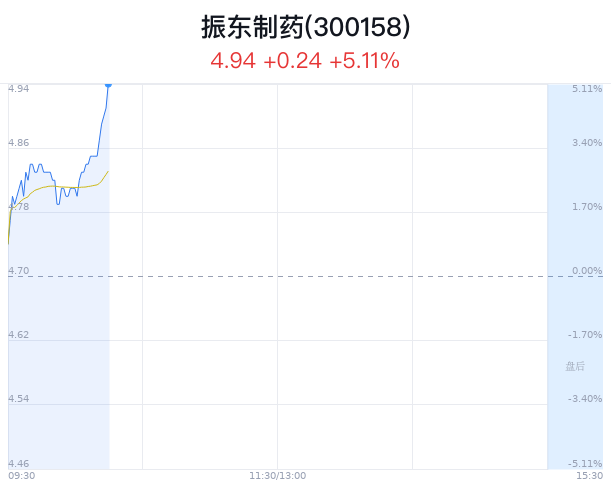 05月06日,振东制药(300158)股价大幅上涨,截至10点14分,振东制药上涨5.11%,报4.94元/股,创近1月新高,成交8276万元,换手率1.67%,振幅4.26%。