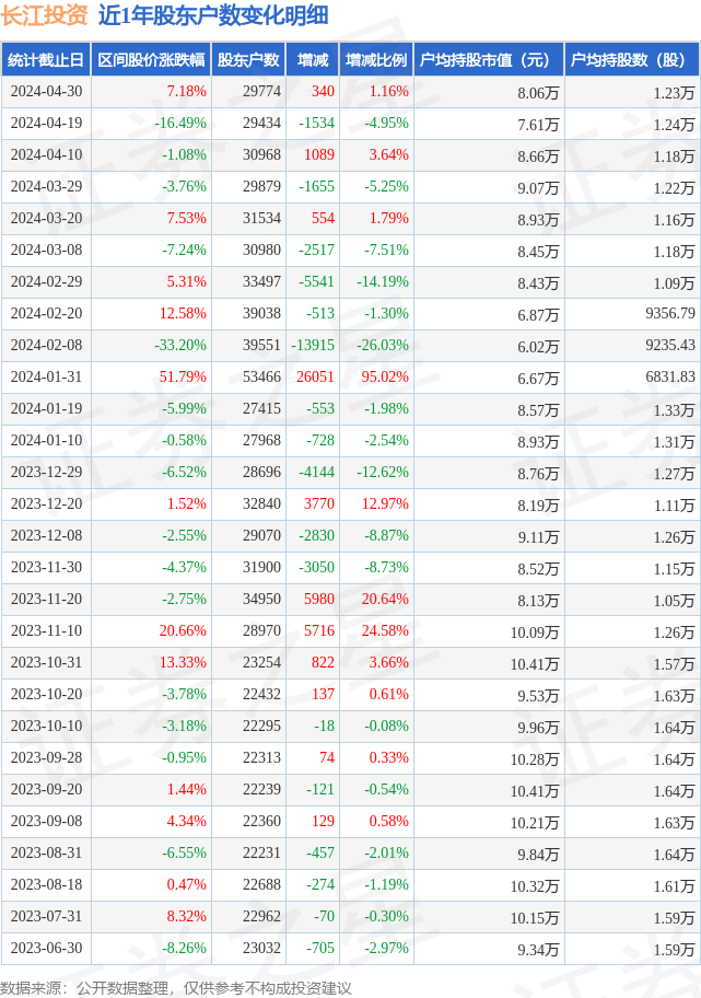 从股价来看,2024年4月19日至2024年4月30日,长江投资区间涨幅为7.18%,在此期间股东户数增加340.0户,增幅为1.16%。