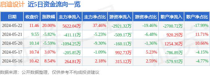 5月22日的资金流向数据方面,主力资金净流入5622.04万元,占总成交额37.46%,游资资金净流出2921.32万元,占总成交额19.46%,散户资金净流出2700.72万元,占总成交额17.99%。