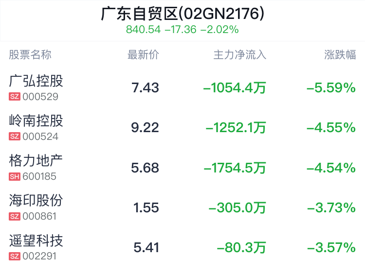 05月23日,广东自贸区概念盘中跳水,截至13点19分,广东自贸区概念整体指数下跌2.02%,报840.540点。