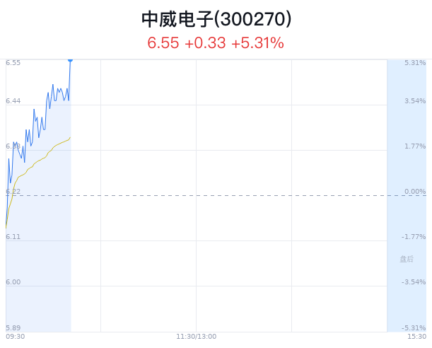 06月18日,中威电子(300270)股价大幅上涨,截至10点10分,中威电子上涨5.31%,报6.55元/股,成交1.32亿元,换手率8.56%,振幅7.40%。