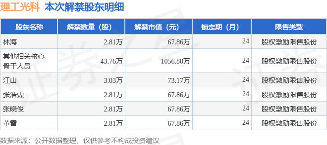 证券之星消息,根据市场公开信息整理,理工光科(300557)于6月21日将有58.03万股限售股份解禁,为公司股权激励限售股份,占公司总股本0.62%。(本次数据根据历史公告整理得出,实际情况以上市公司最新公告为准)最近一年内,该股累计解禁470.0万股,占总股本的5.05%。本次解禁后,公司还有156.47万股限售股份,占总股本1.68%。具体如下图所示: