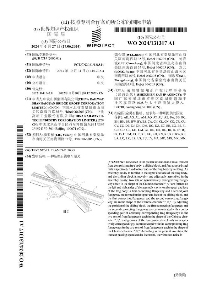 证券之星消息,根据企查查数据显示中铁工业(600528)公布了一项国际专利申请,专利名为“一种新型有轨电车辙叉”,专利申请号为PCT/CN2023/128844,国际公布日为2024年6月27日。