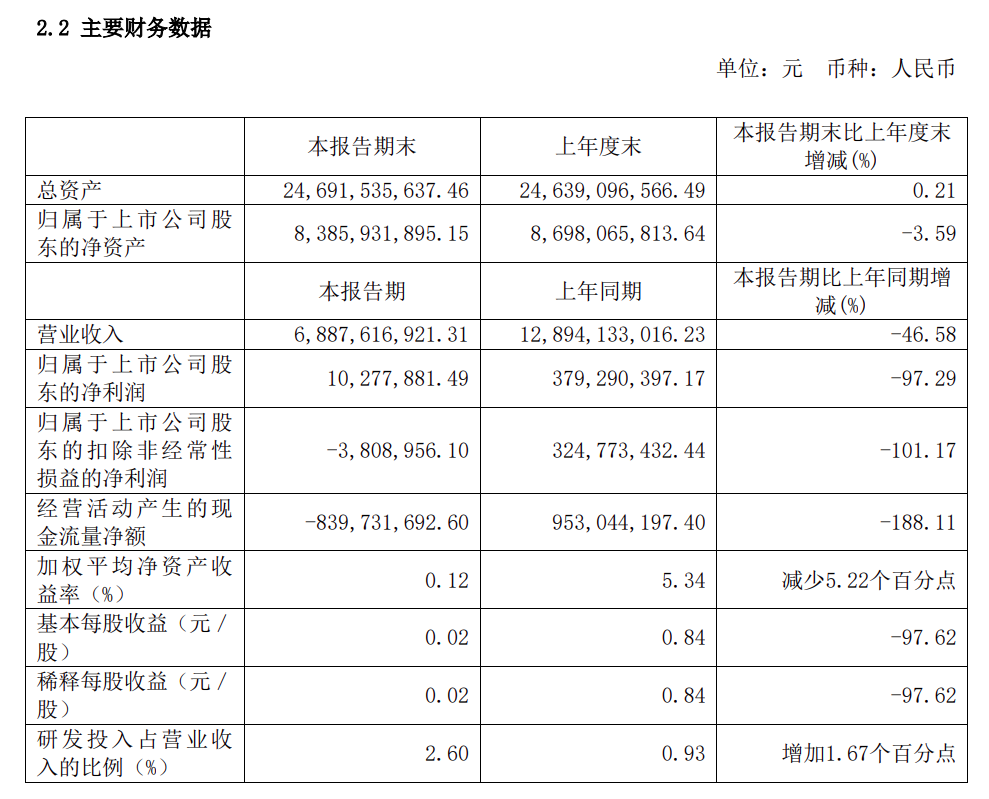 今年上半年,公司实现营业收入68.88亿元,同比下降46.58%;归母净利润1027.79万元,同比下降97.29%,业绩表现远低于市场预期;扣非净利润-380.90万元,上年同期3.25亿元;经营活动产生的现金流量净额为-8.40亿元,上年同期为9.53亿元。
