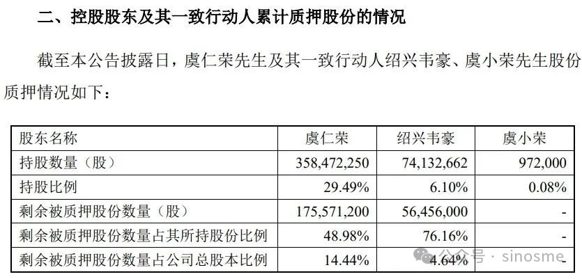 根据韦尔6月15日发布的最新公告,虞仁荣及其一致行动人“绍兴韦豪”、虞小荣,目前共持有4.33亿股韦尔股份。其中,2.32亿股被质押,占其持有公司股份总数的53.51%。