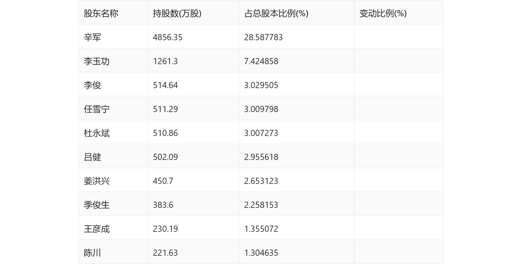 半年报显示,2024年上半年末公司十大流通股东中,持股最多的为辛军,占比28.59%。十大流通股东名单相比2024年一季报维持不变。在具体持股比例上,李俊、季俊生持股有所下降。