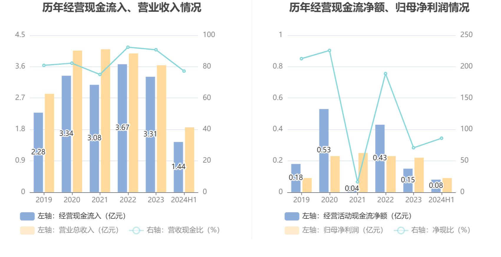 2024年上半年,公司营业收入现金比为77.19%,净现比为85.99%。