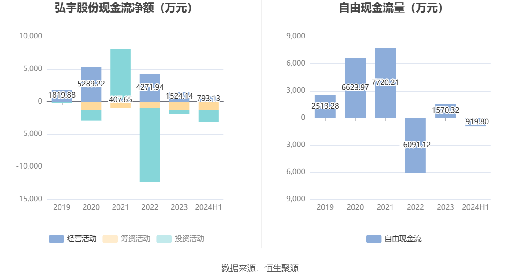 进一步统计发现,2024年上半年公司自由现金流为-919.80万元,上年同期为2360.07万元。