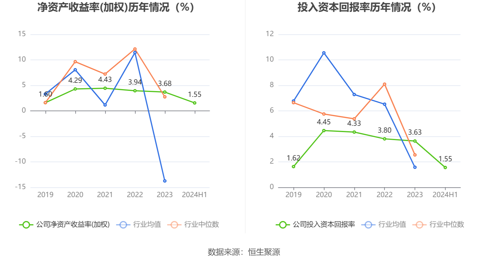 数据显示,2024年上半年公司加权平均净资产收益率为1.55%,较上年同期下降0.27个百分点;公司2024年上半年投入资本回报率为1.55%,较上年同期下降0.26个百分点。