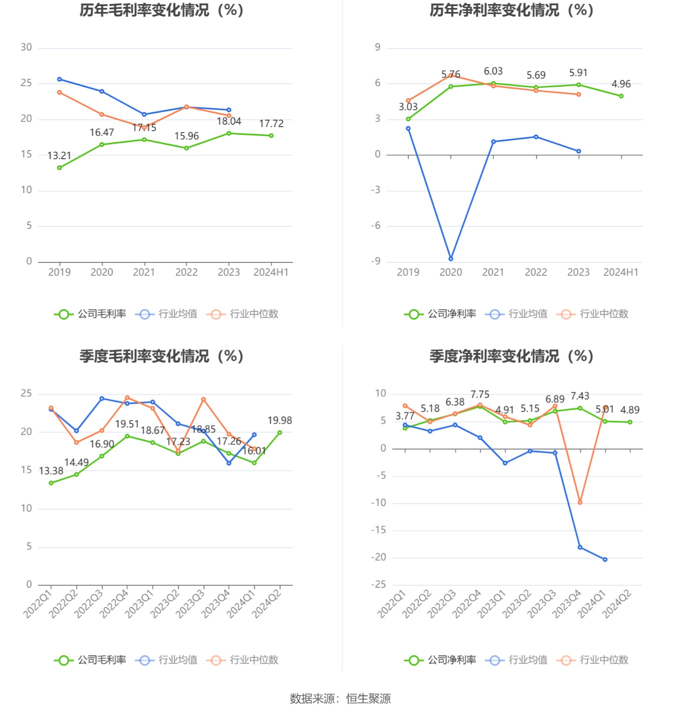 2024年上半年,公司毛利率为17.72%,同比下降0.34个百分点;净利率为4.96%,较上年同期下降0.06个百分点。从单季度指标来看,2024年第二季度公司毛利率为19.98%,同比上升2.75个百分点,环比上升3.97个百分点;净利率为4.89%,较上年同期下降0.26个百分点,较上一季度下降0.12个百分点。